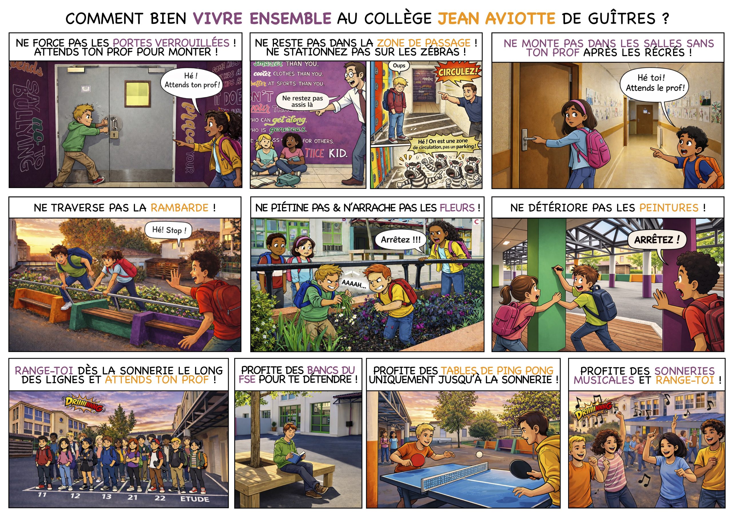Voici une BD réalisée par M. Pappalardo afin d’illustrer quelques codes de vie. Des petites capsules vidéo réalisées par les élèves de 4e en anglais sont en projet.