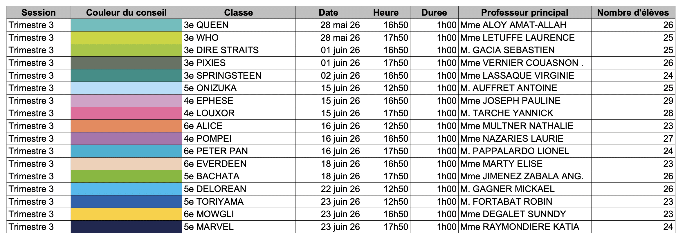 Planning des conseils de classe du 3e Trimestre !